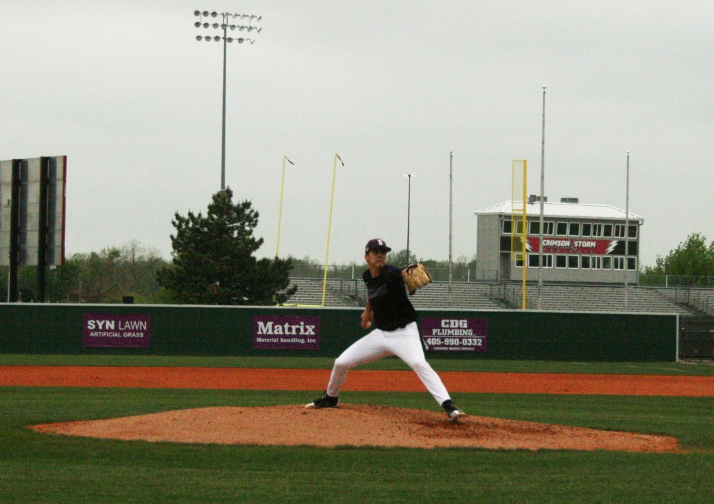 Bethany junior Charlie Tolle delivers a pitch in the Bronchos’ 13-4 loss to Blanchard Monday (April 15,, 2024). (PHOTO: Joel Reagan)