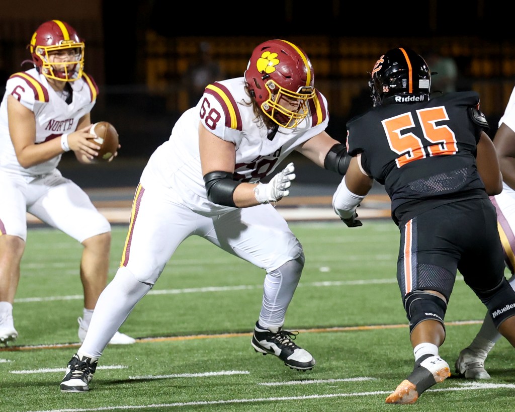 Putnam City North senior offensive lineman Garrett Kitchko blocks Putnam City senior defensive lineman Sy Phipps during the Pirates’ 21-7 win Friday (Sept. 13, 2024). (PHOTO: Richard T. Clifton)