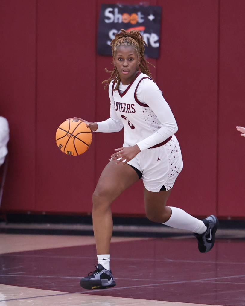 Putnam City North senior Nykaiya Dillard dribbles down the floor in the Lady Panthers’ 84-45 win over Piedmont Tuesday (Dec. 3, 2024). (PHOTO: Richard T. Clifton)