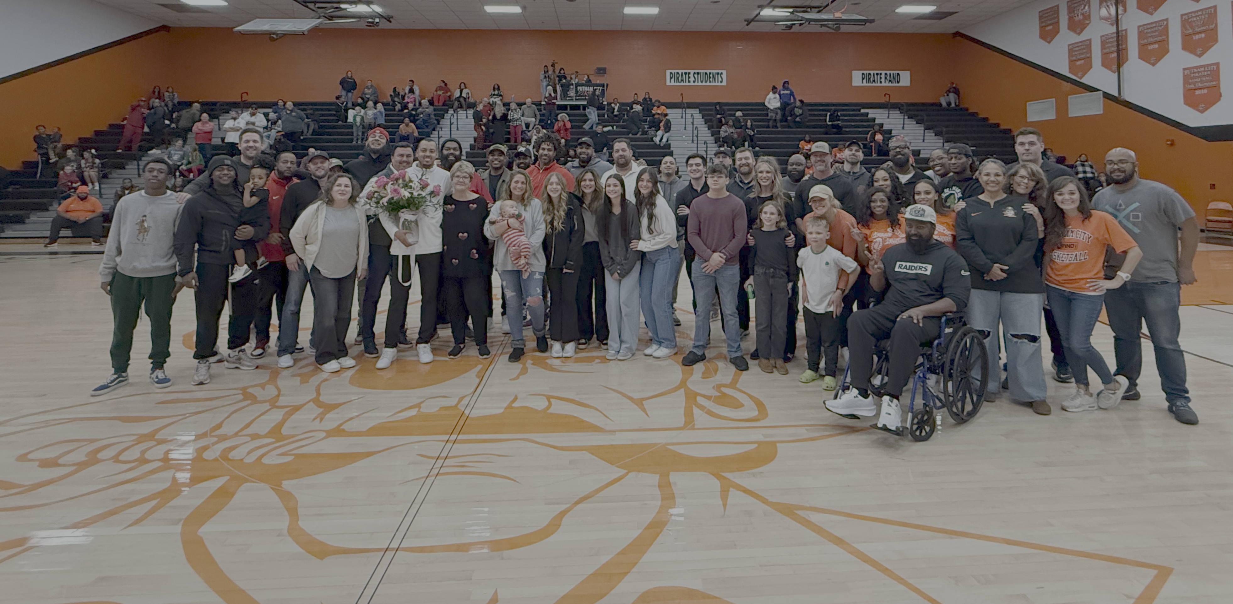 Putnam City basketball alumni and athletic staff join current coach and PC alum Brandon Jackson (standing on the eye patch) in honoring Jacque Burtschi (right of Jackson), the widow of legendary Pirate coach A.D. Burtschi, Tuesday (Dec. 17, 2024). (PHOTO: Joel Reagan)