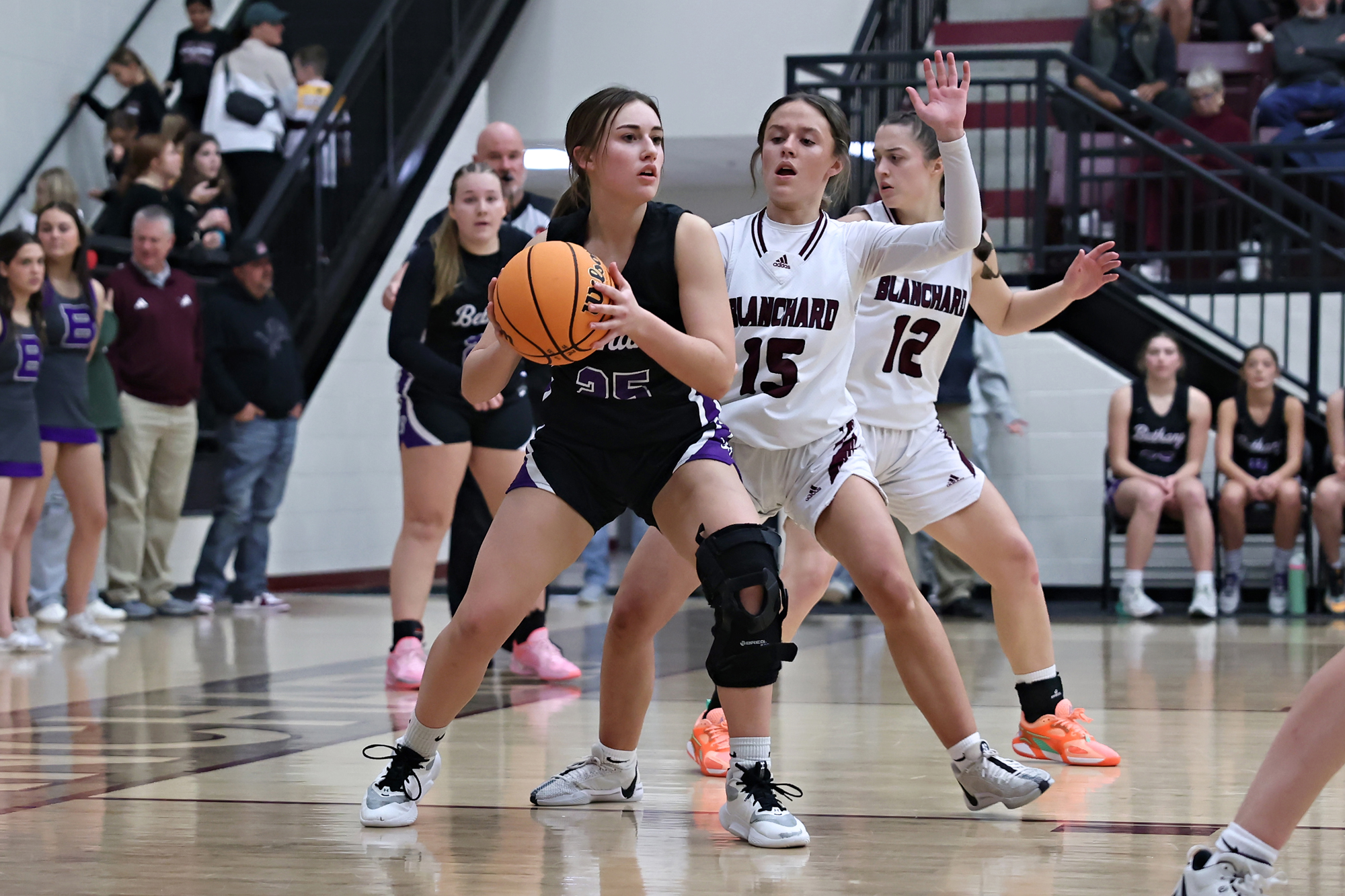 Bethany sophomore Camryn Regier dribbles around a Blanchard defender Tuesday (Jan. 7, 2025). (PHOTO: Kristie Escoe/Life in Action Photography)