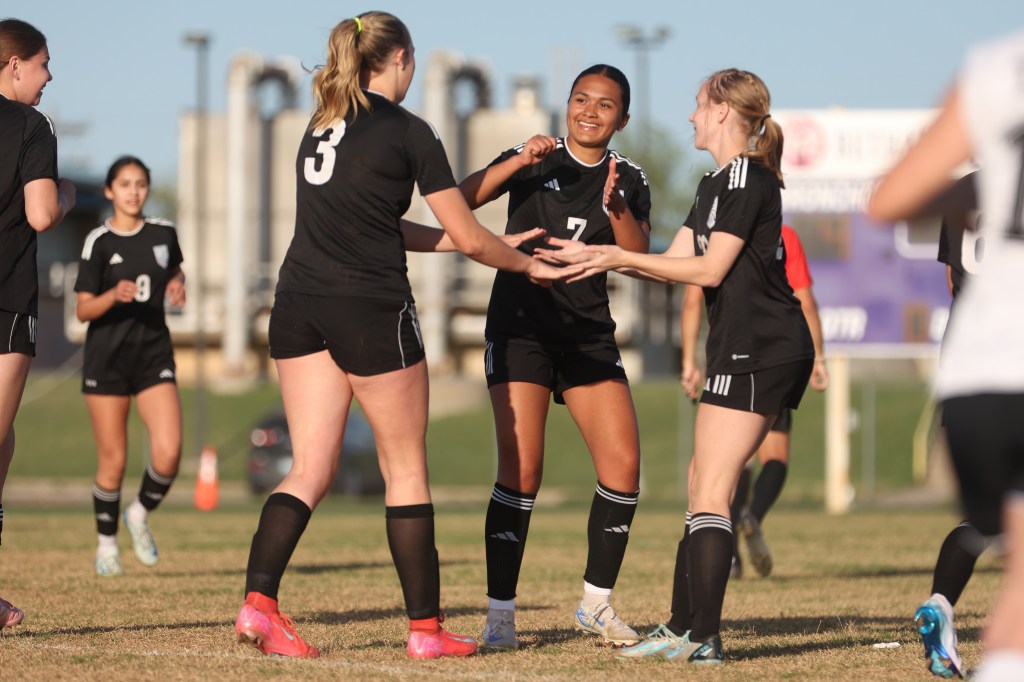 Bethany sophomore Camryn Regier (#3), freshman Jozelin Hernandez (#7), and freshman Savannah Ayers (#23) celebrate a goal in the Lady Bronchos’ 10-1 rout of Ardmore Tuesday (April 8, 2025). (PHOTO: Kristie Escoe/Life in Action Photography)