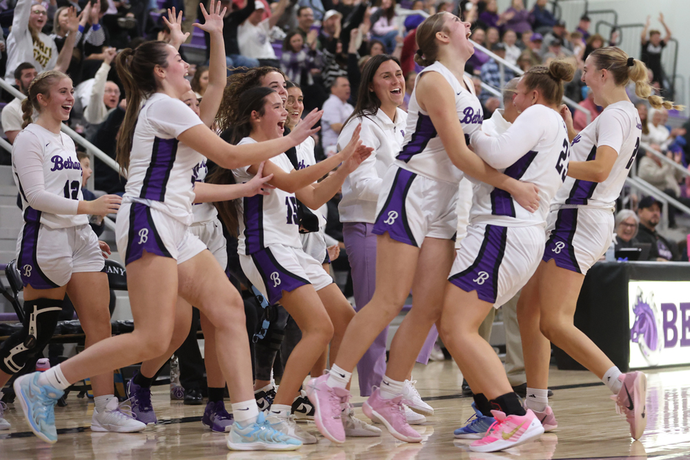 A fun moment for Linn came as time expired in the third quarter. She stole the ball, ran down the floor and drained a 3-pointer halfway between midcourt and the top of the key. After the buzzer beater, she leaped in the air as teammates mobbed her. The shot extended Bethany’s lead to 43-25.